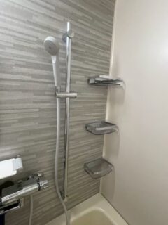 さらに、壁には収納棚を設置し、シャンプーや小物類がすっきり置けるようになっています。